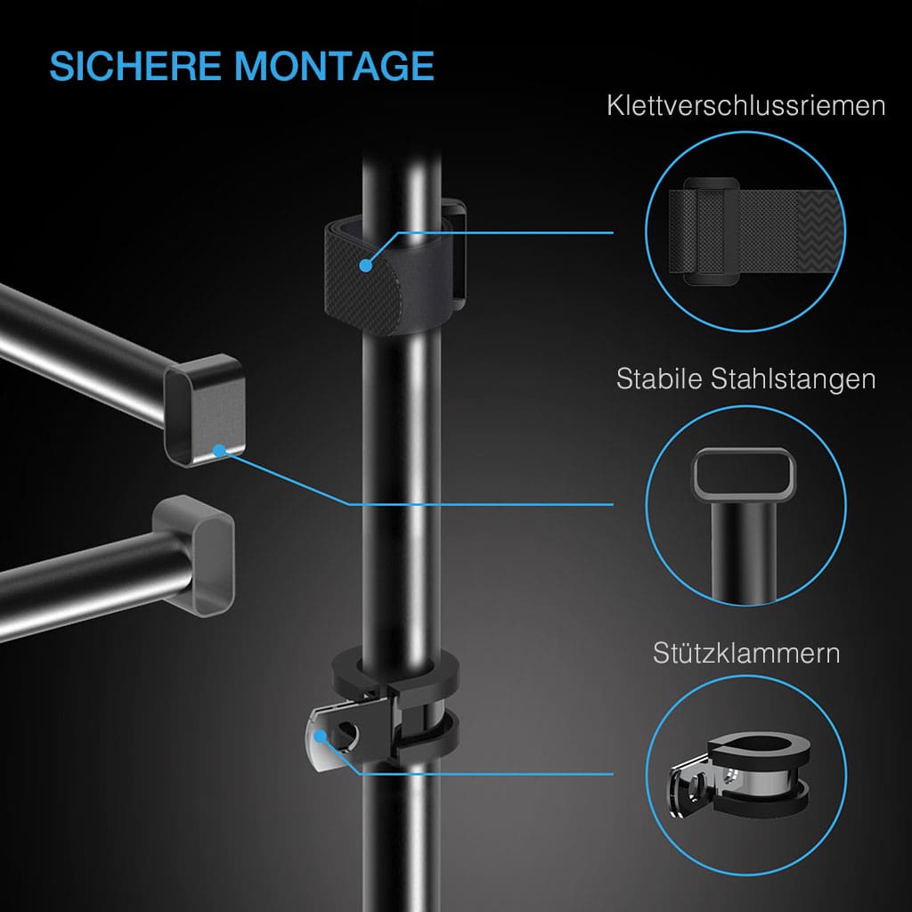 Grip Pads und Klettverschlüsse halten die Stangen fest und ermöglichen eine mühelose Höhenverstellung.