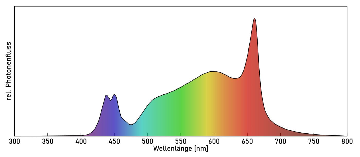 Mit seinem dimmbaren Photonenfluss von über 300 μmol/s kann auf einer Fläche von 60 x 60 cm eine Photonenflussdichte (PPFD) von über 800 μmol/(-m²-s) erreicht werden.