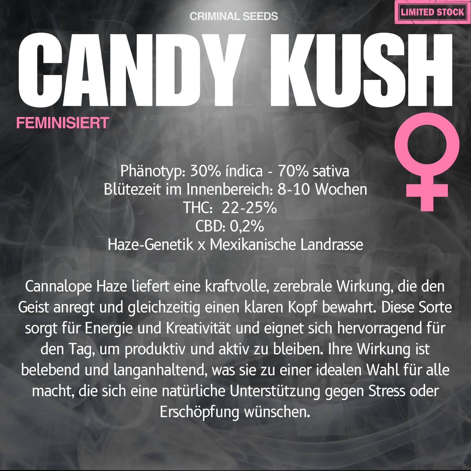 Candy Kush Feminisiert von Criminal Seeds ist eine indica-dominierte Sorte, entstanden aus der Kreuzung von Sweet Special und Royal Kush. Mit 18–22?% THC, einem intensiven süßen Aroma und einer schnellen Blütezeit von nur 7 Wochen liefert Candy Kush eine perfekte Mischung aus körperlicher Entspannung und leichter Euphorie. Ideal für Anfänger wie erfahrene Züchter, die schnelle Ernten und hohe Qualität wünschen.