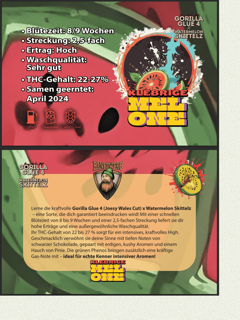 Entdecke die Kreuzung aus Gorilla Glue #4 x Watermelon Skittlez. Diese Sorte überzeugt mit einer schnellen Blütezeit von 8–9 Wochen und einer 2,5-fachen Streckung. Das bedeutet, dass die Pflanze beim Übergang in die Blüte ihre Größe mehr als verdoppelt. Sie liefert dir hohe Erträge und zeichnet sich durch eine sehr gute Waschqualität aus.