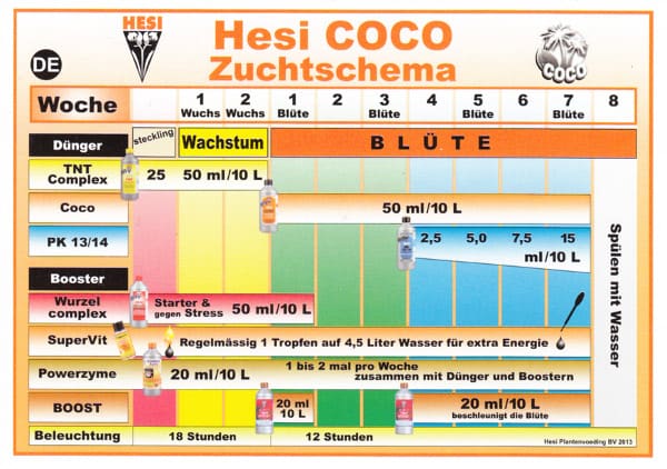 Einkomponentendünger für die Blütephase von Pflanzen auf Cocosubstraten. Hesi Coco enthält sowohl organischen als auch mineralischen Stickstoff, woraus ein niedriger EC-Wert resultiert, da organische Stickstoffverbindungen einen EC-Wert von 0 haben. Alle Mikronährstoffe sind in Chelatform ausreichend vorhanden, neben Vitaminen (B1, B2, B6), Aminosäuren, Pflanzenzuckern und Enzymen. So wird schnell eine gesunde Mikroflora geschaffen. Die Summe aller beteiligten Komponenten unterstützt die auf hohen Energieniveau ablaufende Blüte. Soll diese noch kräftiger ausfallen, wird ab der 2.Hälfte der Blütephase der Einsatz von Hesi PK 13/14 angeraten. Beide Produkte dürfen nicht überdosiert werden!