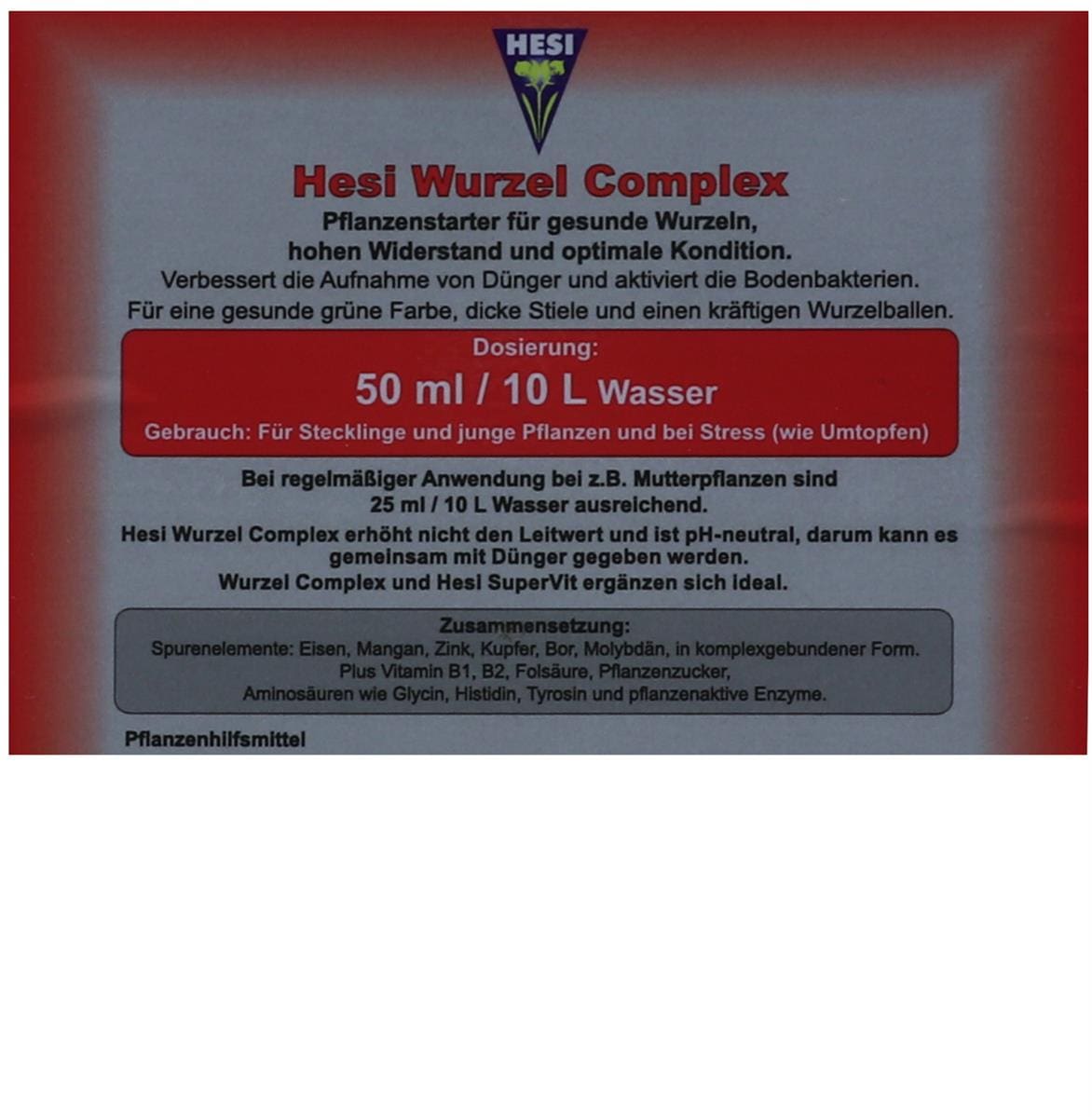 Der Hesi Wurzel Complex Wurzelstimulator für den Start von bewurzelten Stecklingen nach dem Einpflanzen und jungen Pflanzen nach dem Umpflanzen, mildert den sogenannten Umpflanzschock. Für alle Substrate geeignet erzeugt er kräftige Wurzeln und vitale Pflanzen durch verbesserte Nährstoffaufnahme und aktivierte Bodenmikroflora. Enthält die essentiellen Spurenelemente als schnell assimilierbare Chelate, Vitamine B1, B2, B12, Folsäure, Pflanzenzucker, die Aminosäuren Glycin, Histidin und Thyrosin. Erhöht nicht den EC-Wert und ist pH-neutral, kann also mit Dünger zusammen gegeben werden, da er selbst keinen Dünger enthält.