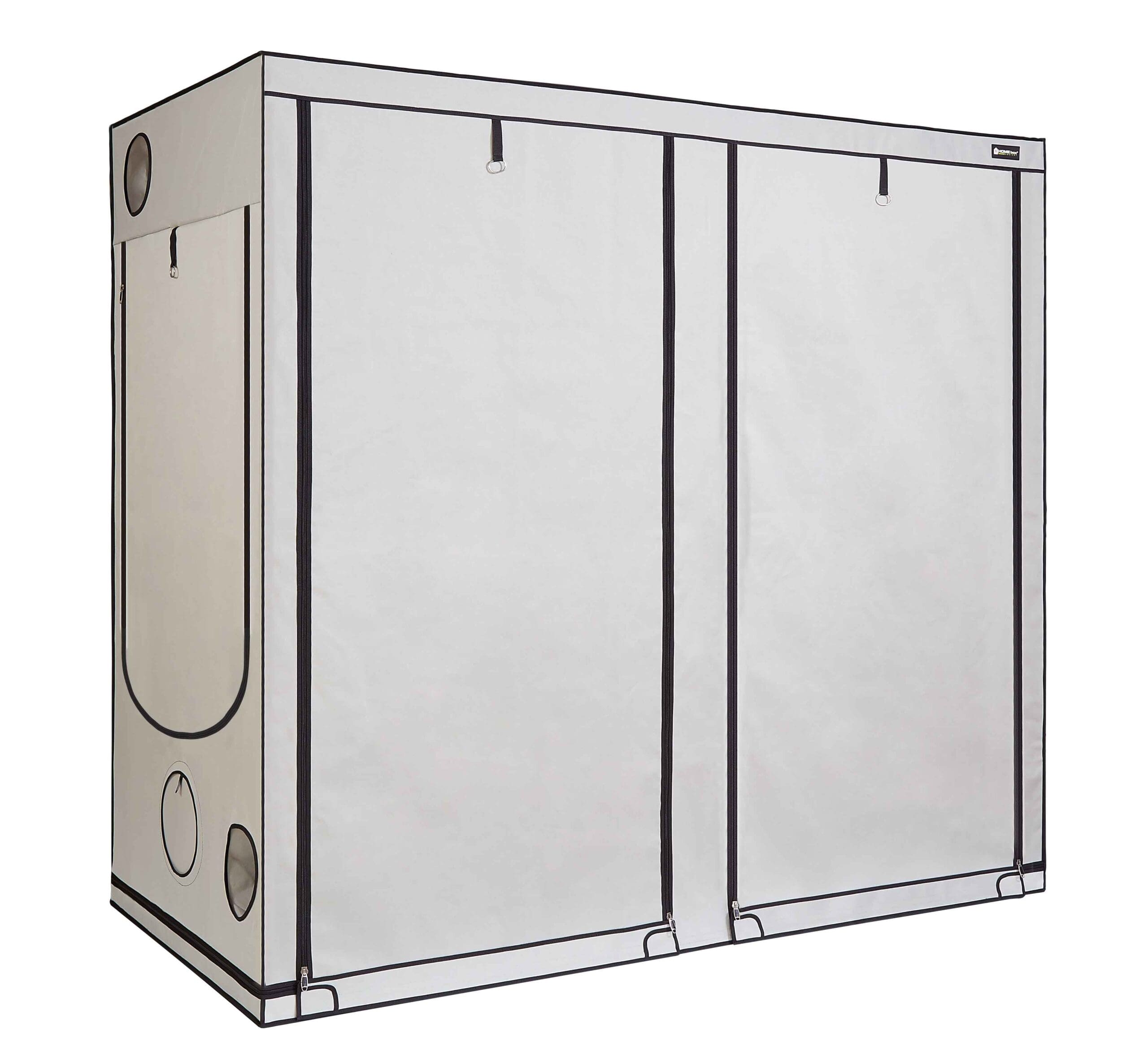 Züchter die MEHR wollen finden hier: 2,2m Höhe für lange blühende Pflanzen, ZWEI 250 mm Anschlüsse im Dach, parallel angeordnete 150mm Tubes rechts und links und VIER OmniFlow-Airvents! Die R240+ kann zwei oder sogar drei 600 Watt Leuchten, fassen und dank des super starken 22mm Rahmengestänges ist sie dann noch lange nicht am Limit! Einige Anwender kombinieren sogar verschiedene Arten von Leuchtkörpern, um ihre Pflanzen mit einem abwechslungsreichen Lichtspektrum zu versorgen. Ohne die PAR+-Innenbeschichtung geht jetzt nichts mehr! Bei der Verwendung mehrerer leistungsstarker Pflanzenleuchten wird sehr viel Wärme erzeugt; daher ist es noch viel wichtiger, dass die Strahlungswärme effektiv weg geleitet wird, während die Pflanze die ganze wertvolle PAR-Energie nutzen kann – bei 1000-W-Leuchten wird der Einsatz luftgekühlter Reflektoren empfohlen. 2x 480W LED-Sets können hier ihre Power komplett ausspielen!