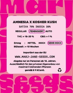 Amnesia Kush ist eine sativa-dominante Sorte (70 % Sativa, 30 % Indica), die durch die Kreuzung der beliebten Sorten Amnesia Haze und Kosher Kush entstanden ist.