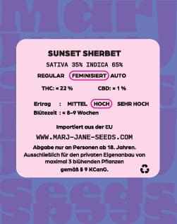 Sunset Sherbet ist eine feminisierte, indica-dominierte Sorte, die aus der Kreuzung von Girl Scout Cookies und Pink Panties entstanden ist. Mit einem THC-Gehalt von 21 % sorgt sie für eine beruhigende und zugleich euphorische Wirkung, ideal zur Entspannung. Ihr Aroma erinnert an fruchtige Beeren und Zitrusnoten. Die Pflanze entwickelt harzreiche Blüten, die sich für den Anbau sowohl indoor als auch outdoor eignen.