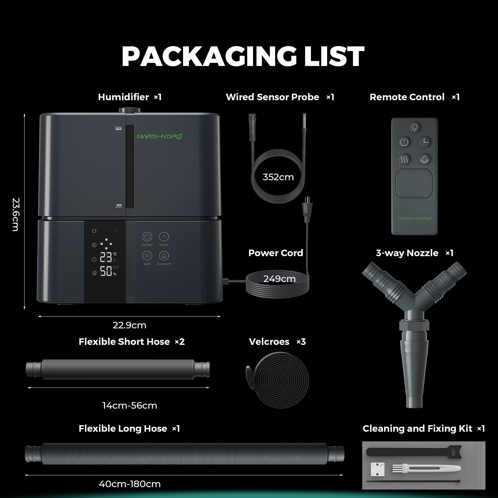 Produkt umfasst: 5L luftbefeuchter für pflanzen x1, Fernbedienung x1, Drahtsensor-Sonde x1, Flexibler kurzer Schlauch x2, Flexibler langer Schlauch x1, Klettverschlüsse x3, 3-Wege-Düse x1, Werkzeugset x1