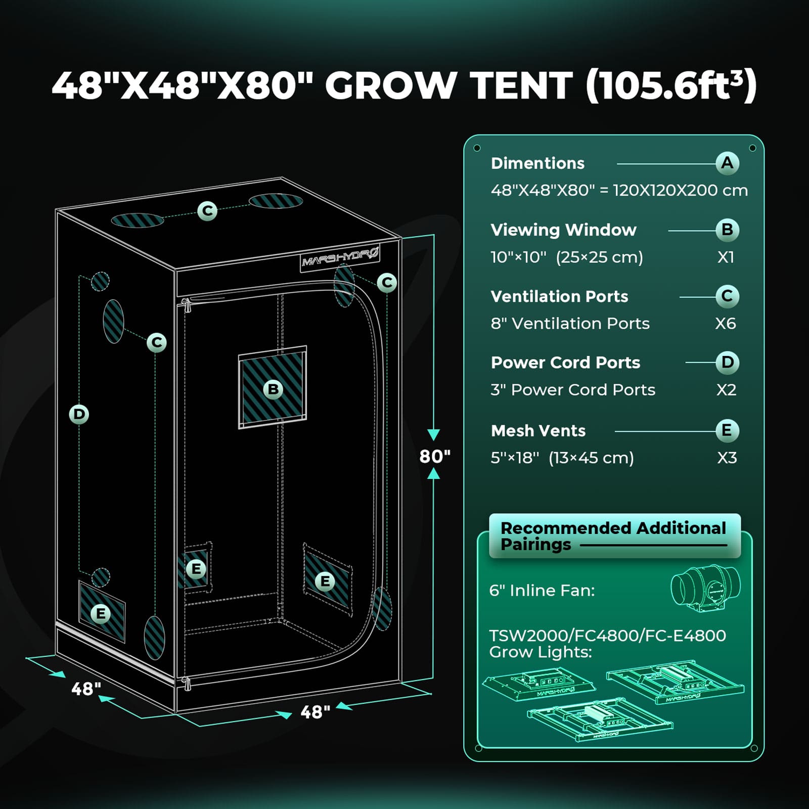 Mars Hydro TSW2000 Complete Grow Tent Kit | 300W LED Grow Light | 120x120x200cm Indoor Grow Tent | 6″ Ventilation System | 6“ Clip-on fan