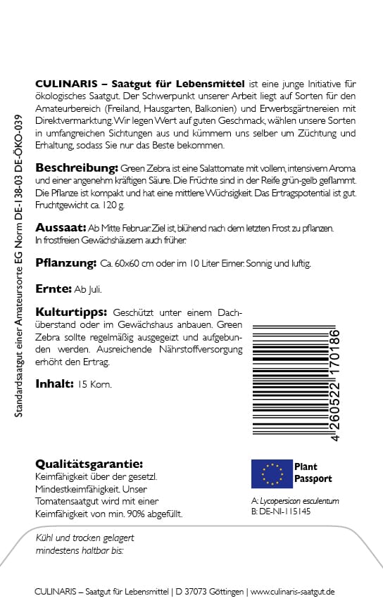 Green Zebra ist eine Salattomate mit vollem, kräftigem Aroma und einer angenehm kräftigen Säure. Die Früchte sind in der Reife grün-gelb geflammt. Das Ertragspotenzial ist gut und bei einem Fruchtgewicht von 120 g eignet sich die Sorte hervorragend für abwechslungsreiche Salate. Die Pflanze ist kompakt und hat eine mittlere Wüchsigkeit. Es empfiehlt sich der geschützte Anbau unter einem Dachüberstand oder im Gewächshaus. Green Zebra ist eine bewährte Sorte in Gärtnereien mit einem Raritätensortiment. Sie sollte regelmäßig ausgegeizt und aufgebunden werden. Eine ausreichende Nährstoffversorgung erhöht den Ertrag. Unsere historischen Sorten wurden im „überdachten Feldanbau“ bei niedrigem Düngeniveau und ohne zusätzliche Bewässerung auf Leistungsfähigkeit, Gesundheit und Geschmack selektiert.