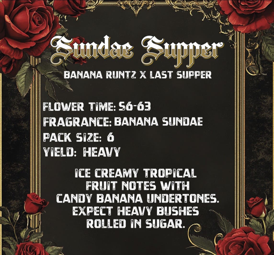 Sundae Supper von Solfire Gardens ist eine feminisierte, indica-dominante Hybridsorte, die aus der Kreuzung von Banana Runtz und Last Supper entstanden ist. Diese Sorte kombiniert die süßen, tropischen Aromen von reifer Banane mit cremigen Vanillenoten und erinnert geschmacklich an ein köstliches Bananeneis. Die Pflanzen entwickeln dichte, harzreiche Blüten mit beeindruckenden Trichomen und liefern hohe Erträge. Mit einem THC-Gehalt von etwa 24–26% bietet Sundae Supper eine potente Wirkung, die sowohl entspannend als auch euphorisierend wirkt. Sie eignet sich für den Innen- und Außenanbau und hat eine Blütezeit von etwa 8–9 Wochen.?