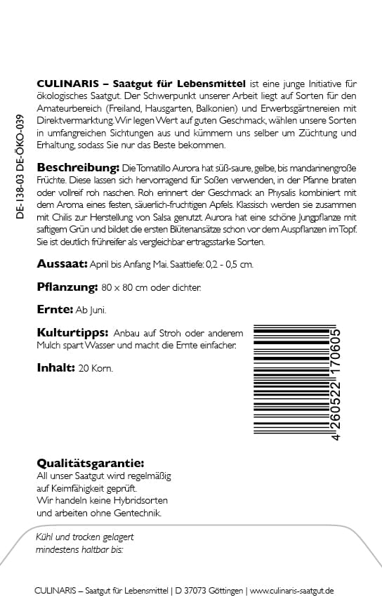 Culinaris | Brauweg 55 | Niedersachsen | Göttingen, Deutschland, 37073 | info@culinaris.de | https://www.culinaris-saatgut.de