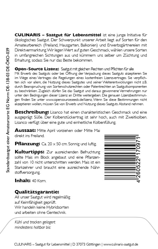 Lisanco ist der erste Open-Source Zuckermais! Und wahnsinnig lecker! Wer Zuckermais mag wird Lisanco lieben. Die Sorte ist gesund, standfest und bringt große, knackige Kolben, die für jede Verwendung geeignet sind.